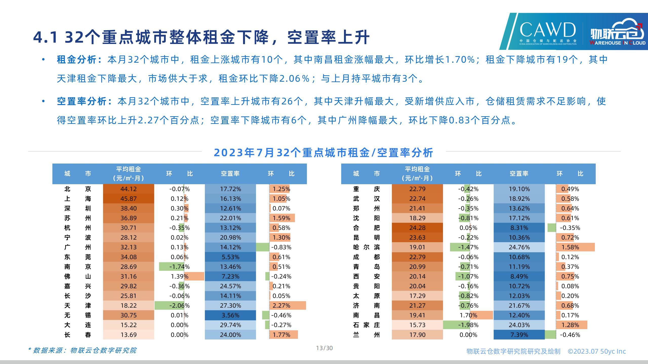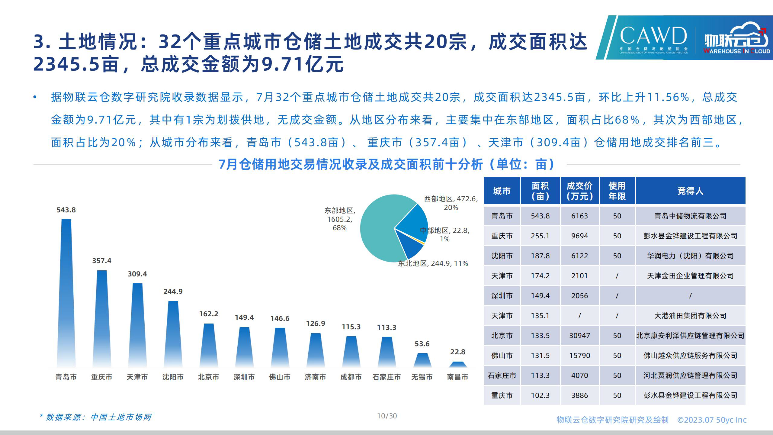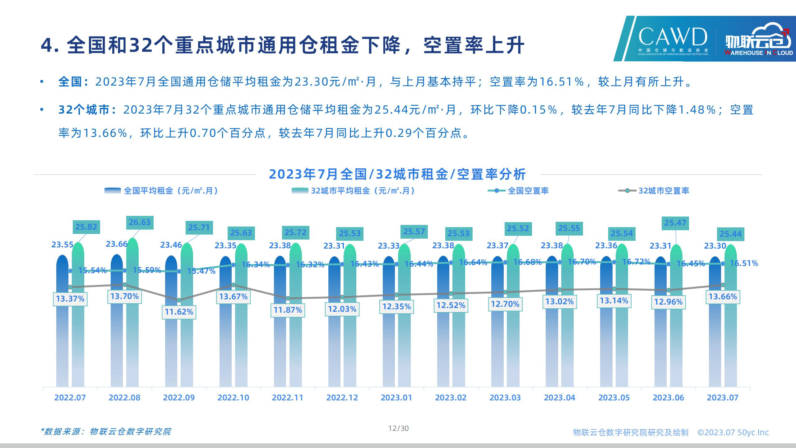 土地情况:7月32个重点城市仓储土地成交共20宗,成交面积达2345.5亩,总成交额为9.71亿元通用仓储租金与空置率分析:全国和32个重点城市通用仓租金下降,空置率上升